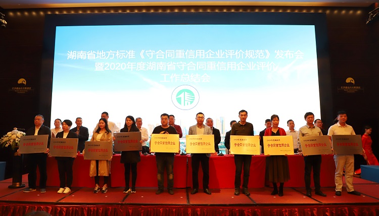 4月30日,湖南省地方标准《守合同重信用企业评价规范》发布会暨2020年度湖南省守合同重信用企业评价工作总结会在长沙召开。省民政厅副厅长张自银、省市场监督管理局总工程师李丁等领导出席会议。会议正式发布了湖南省地方标准《守合同重信用企业评价规范》,汇报了协会2020年工作情况,表彰了2020年度湖南省守合同重信用企业,并举行了授牌仪式。