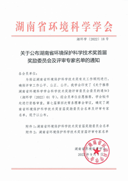 2022年9月7日,湖南省环境科学学会发布《关于公布湖南省环境保护科学技术奖首届奖励委员会及评审专家名单的通知》,suncitygroup太阳新城技术总监胡胜入选湖南省环境保护科学技术奖首届评审专家名单。