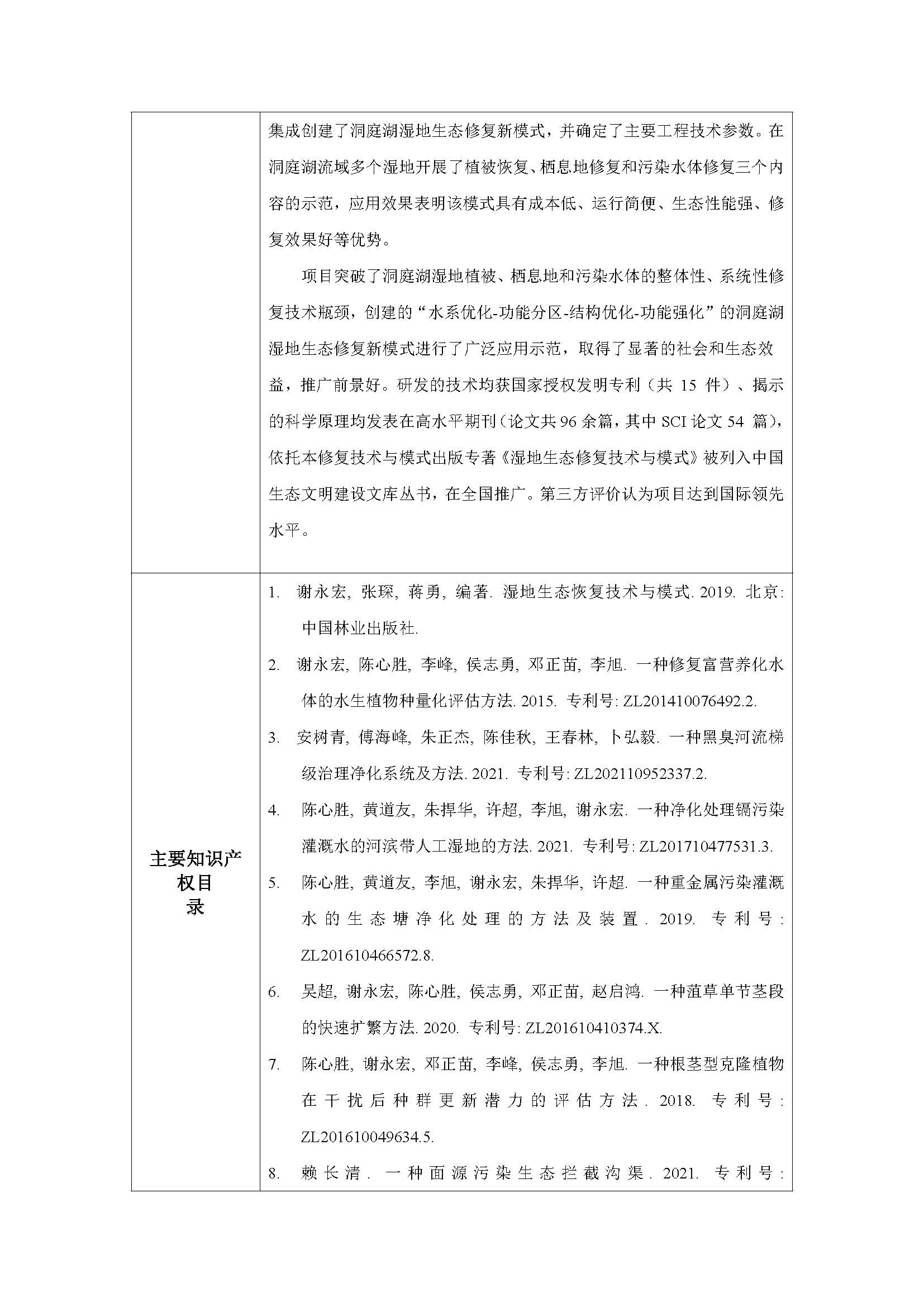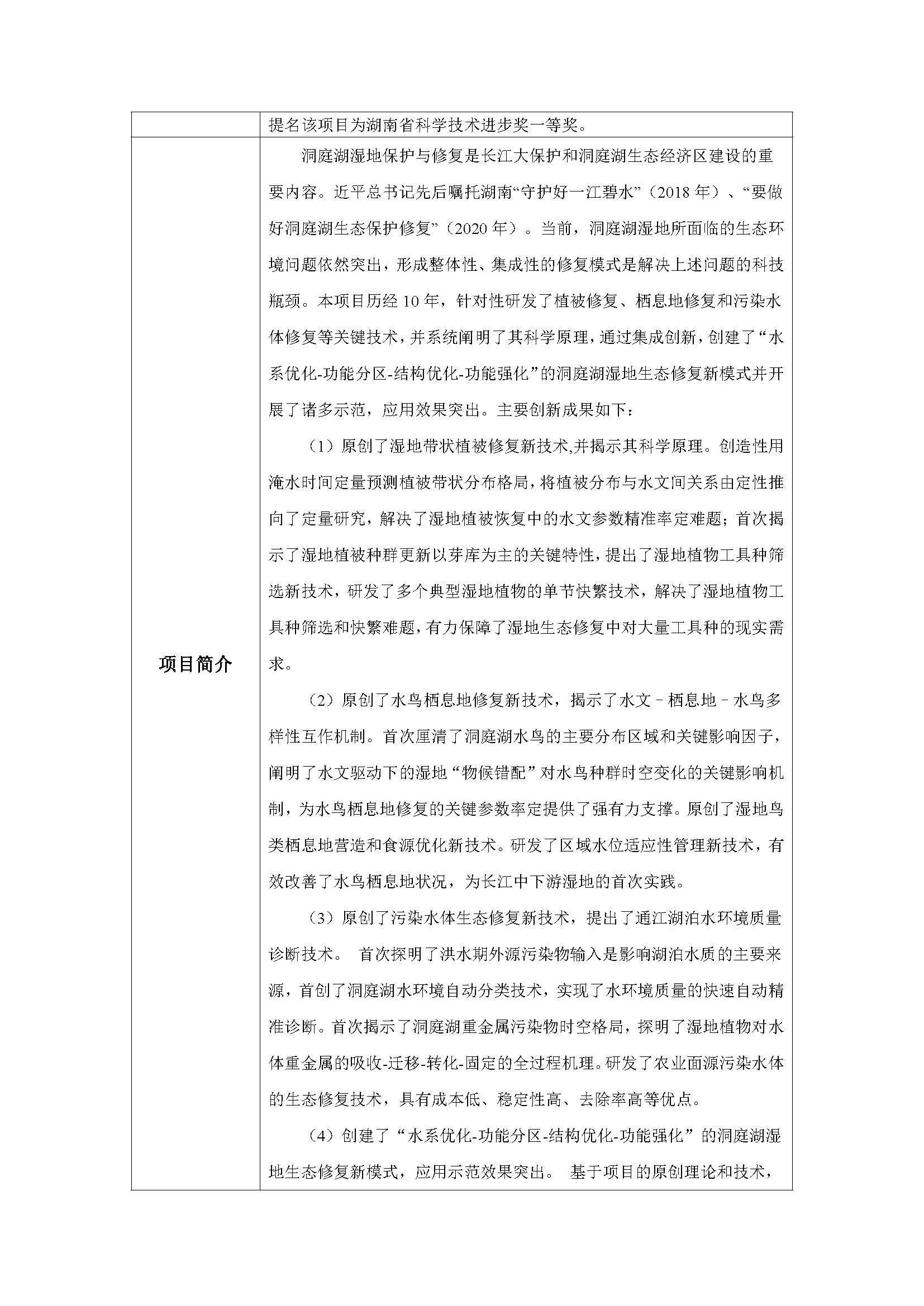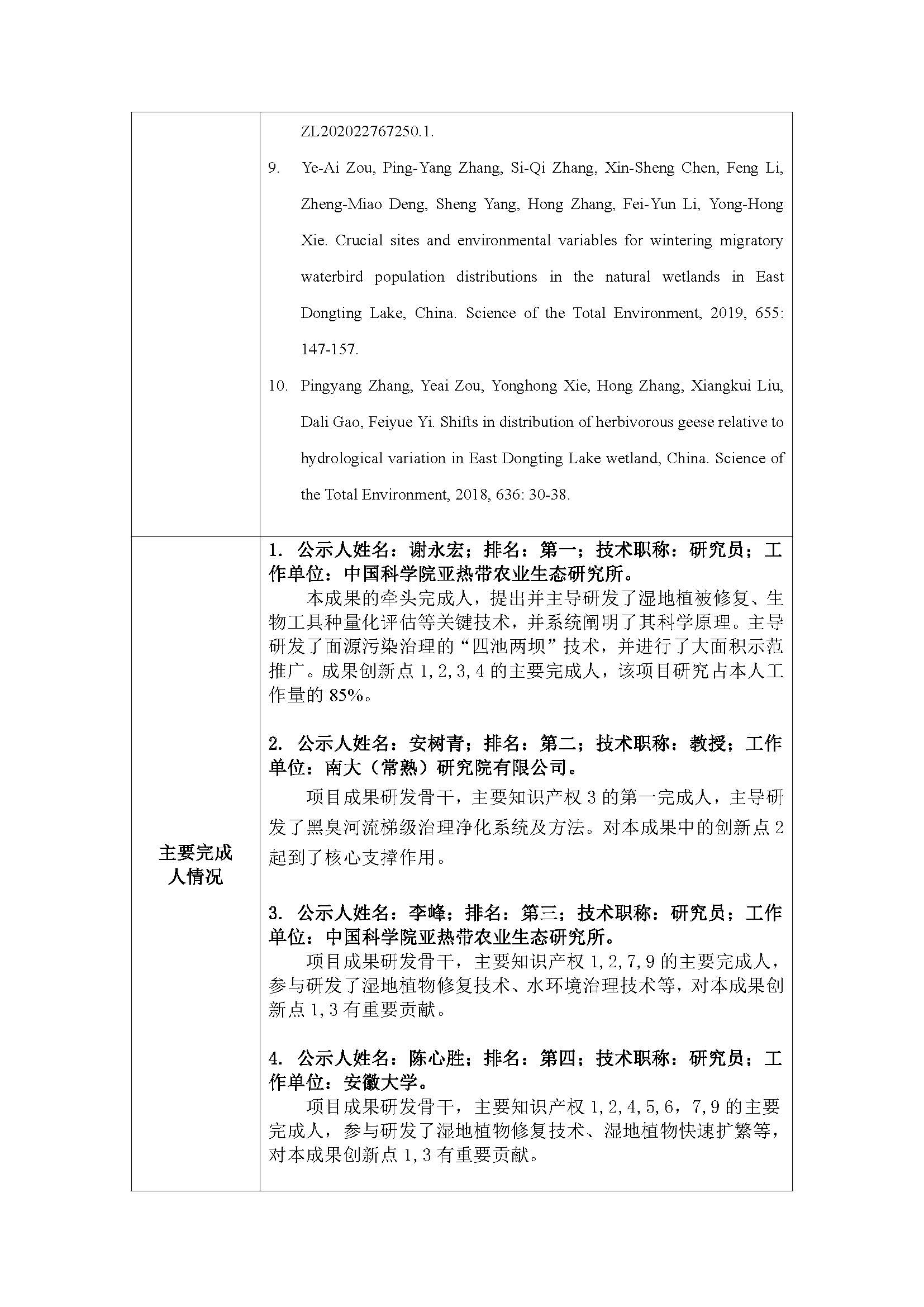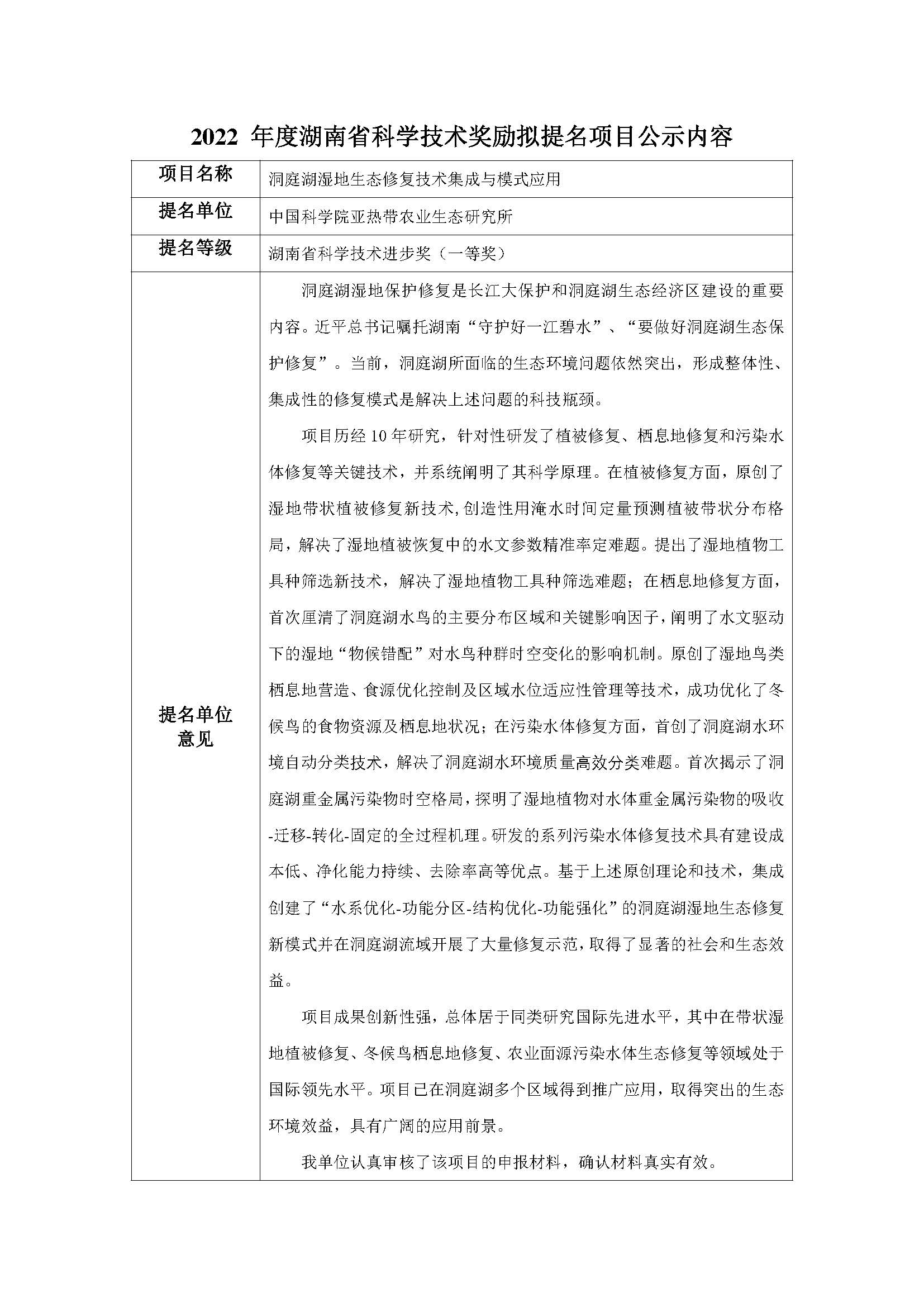 根据《湖南省科学技术奖励办法》和湖南省科技厅《关于做好2022年度湖南省科学技术奖提名工作的通知》相关规定,由中国科学院亚热带农业生态研究所牵头、湖南suncitygroup太阳新城环境科技股份有限公司参与的成果“洞庭湖湿地生态修复技术集成与模式应用”拟申报湖南省科学技术进步奖,现就项目名称、提名单位(专家)及提名等级、主要知识产权和标准规范等目录、主要完成人、主要完成单位及创新推广贡献、主要完成人合作关系说明等信息进行公示,详细内容请见附件。