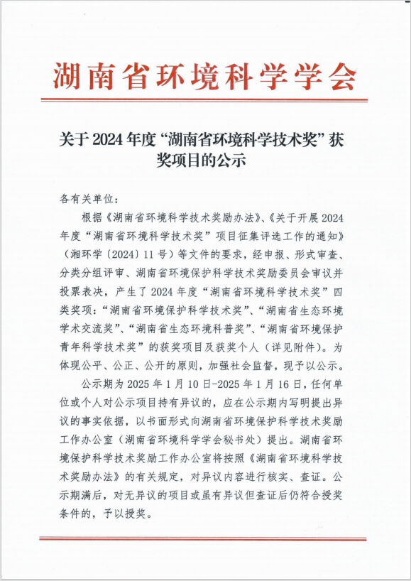 荣获湖南省环境科学技术奖