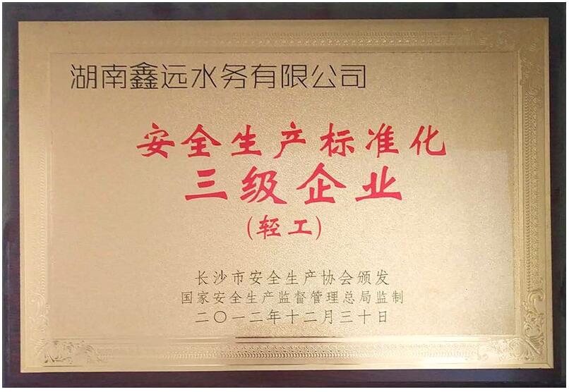 湖南suncitygroup太阳新城水务有限公司被评为“安全生产标准化三级企业”